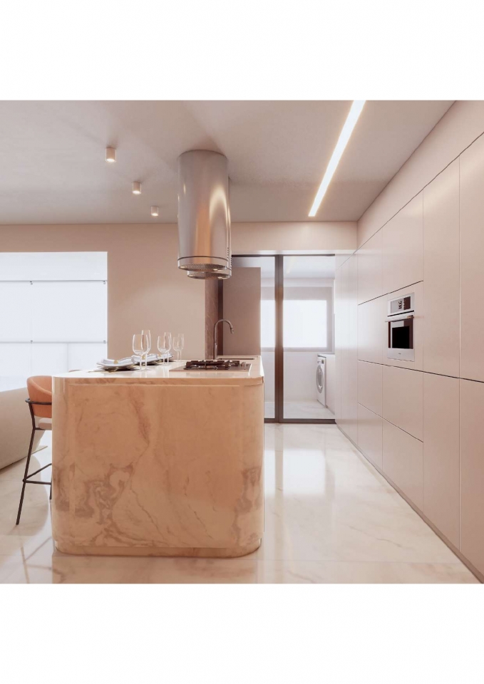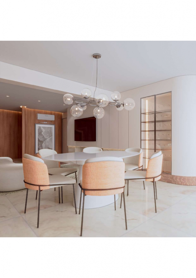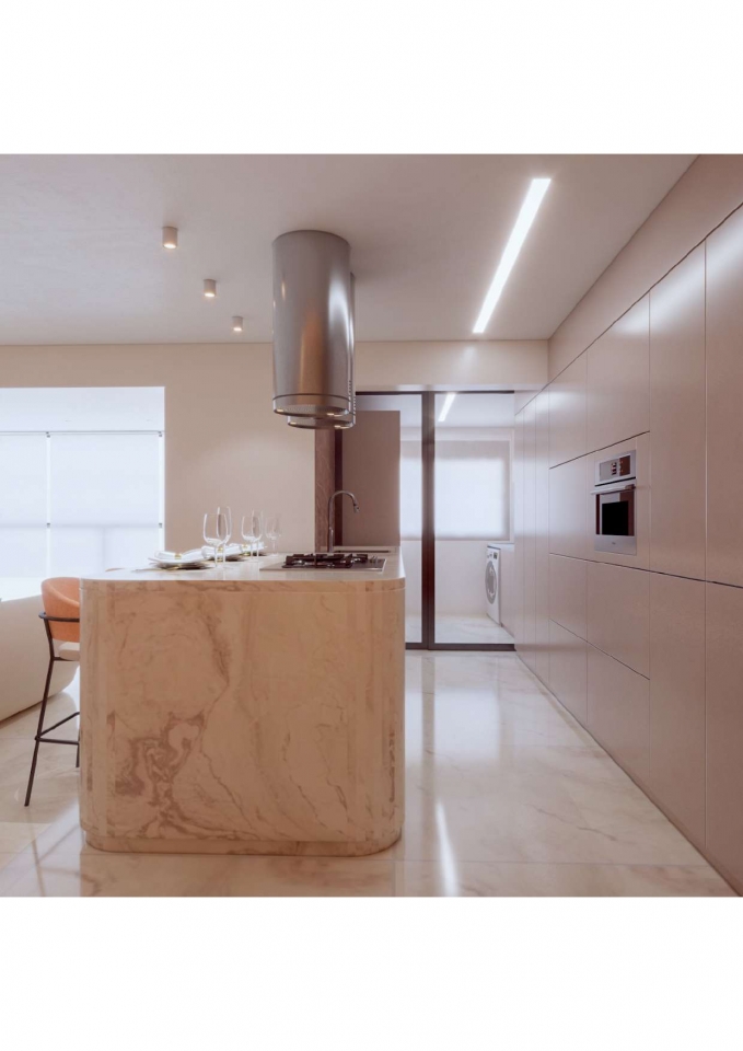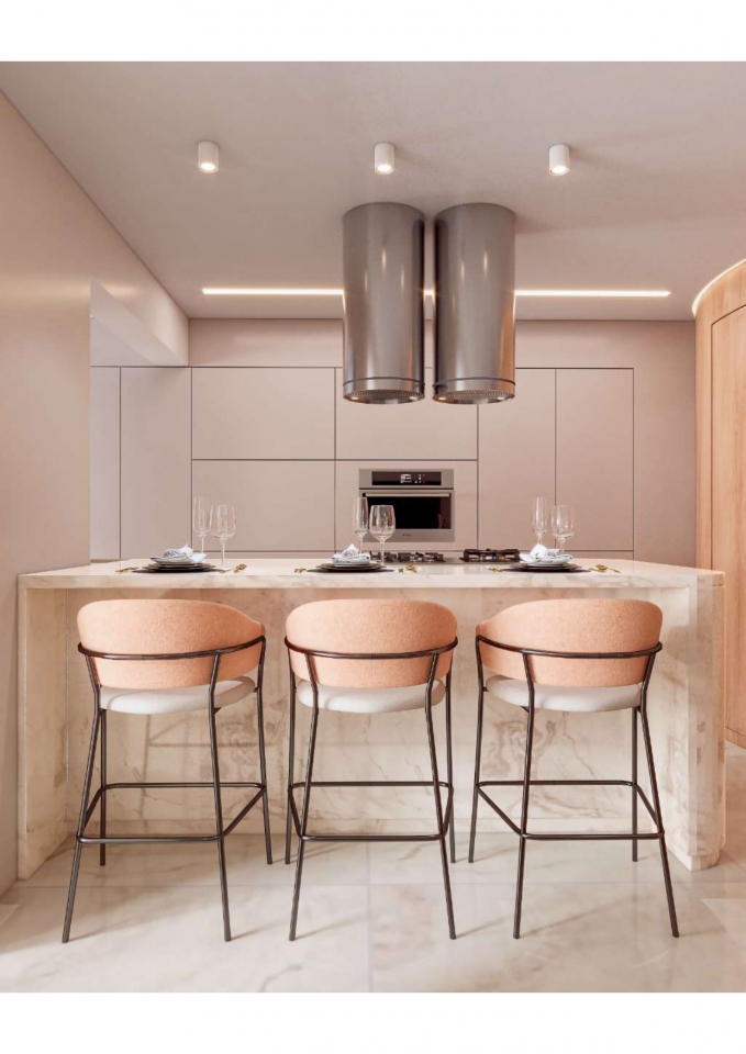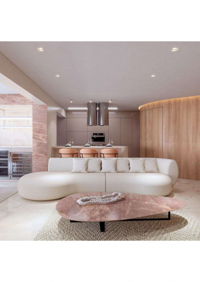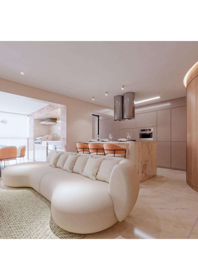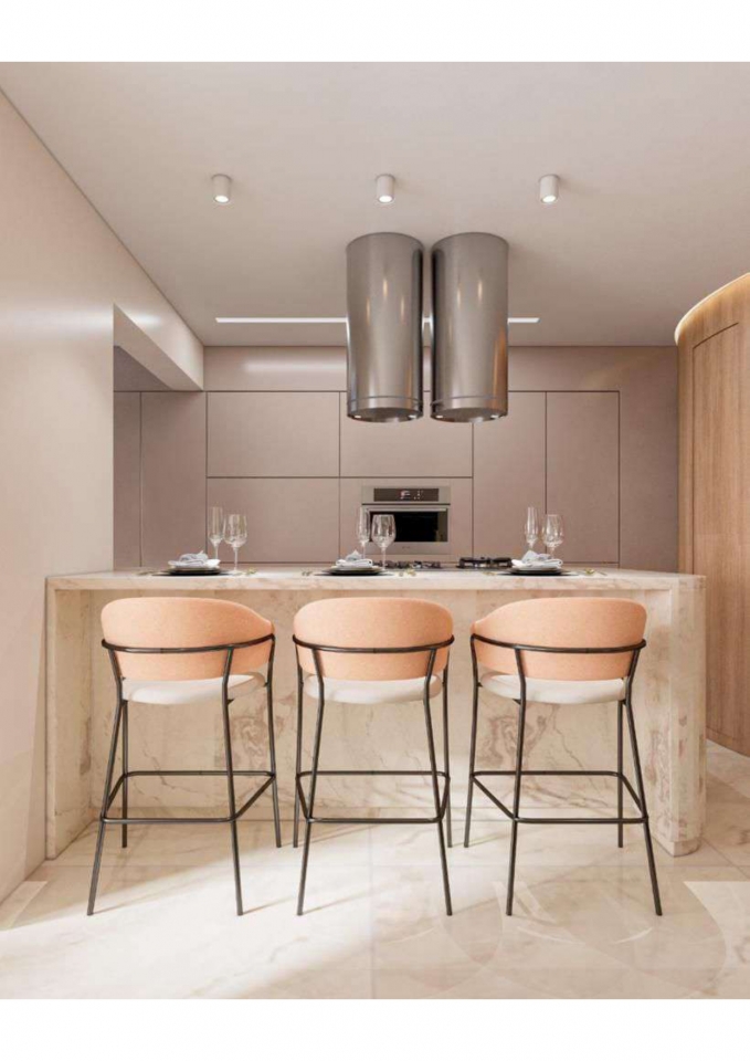 Este apartamento moderno e elegante é projetado com uma combinação harmoniosa de estética contemporânea e funcionalidade. O banheiro apresenta um design compacto e sofisticado, com azulejos em padrão chevron verde-azulado e detalhes minimalistas em madeira, criando uma sensação acolhedora. A área de estar e a cozinha são integradas, promovendo um ambiente aberto e fluido. A sala possui um sofá curvo de design arrojado e uma paleta de cores neutras que conferem serenidade ao espaço. A cozinha destaca-se com uma ilha central em mármore e cadeiras em tons de pêssego, combinando luxo e praticidade. O design inteligente e a iluminação bem planejada garantem um ambiente funcional e sofisticado, ideal para um estilo de vida contemporâneo.