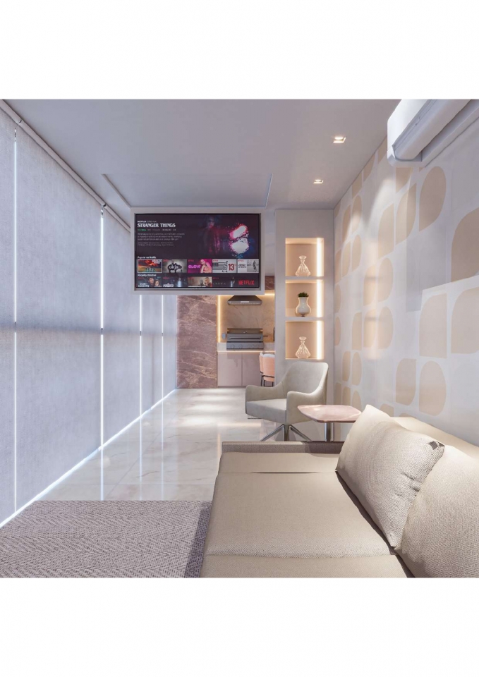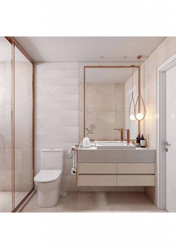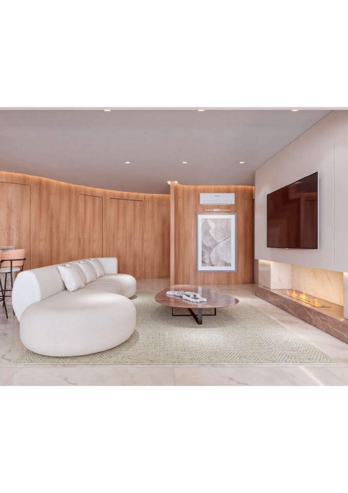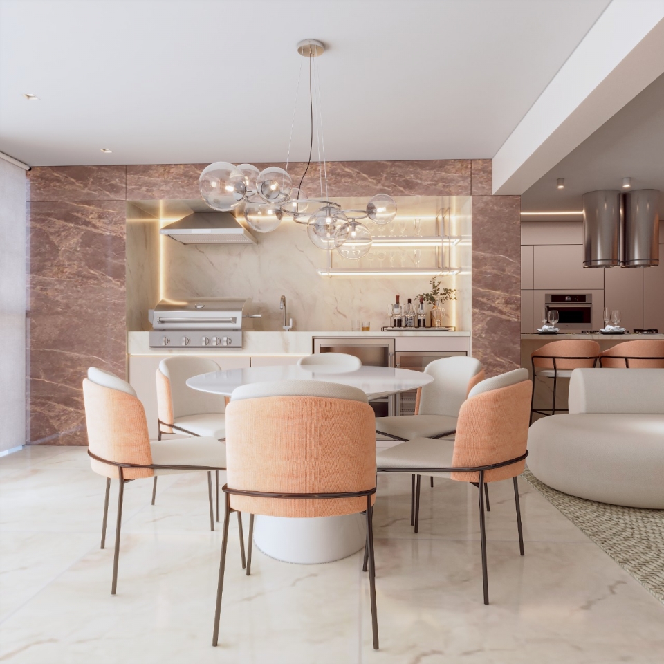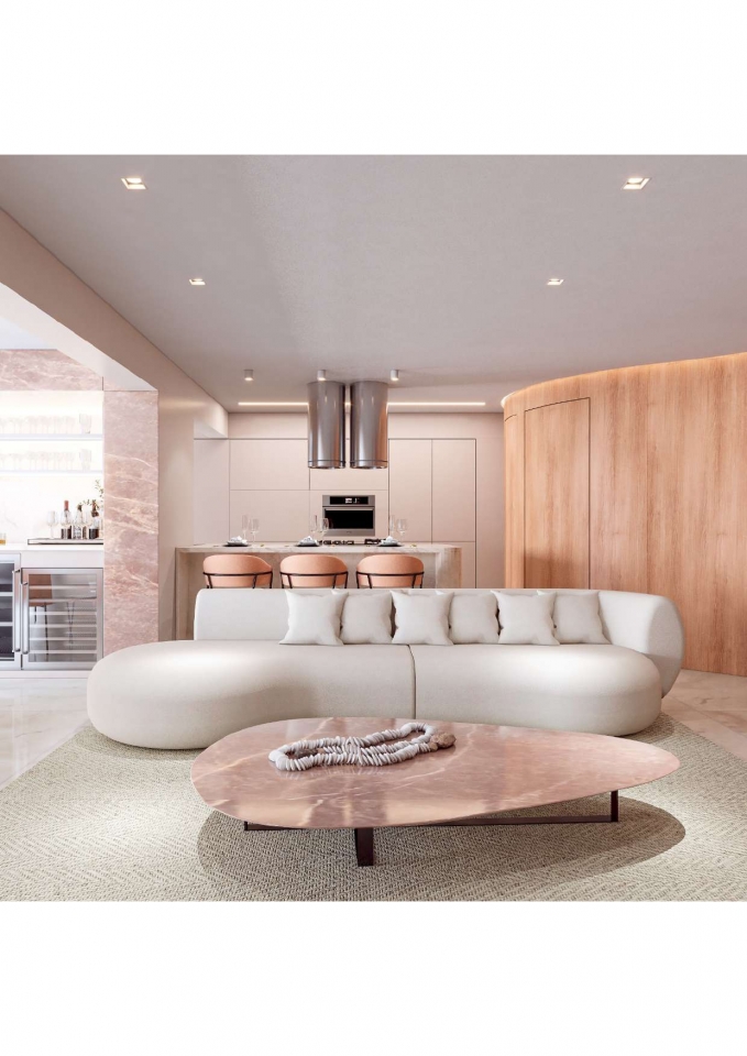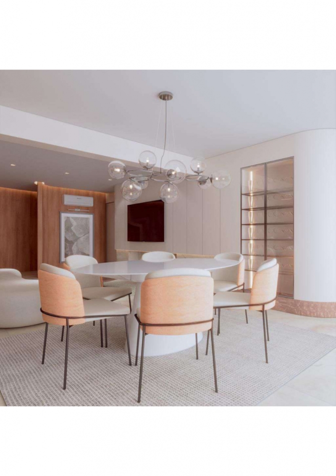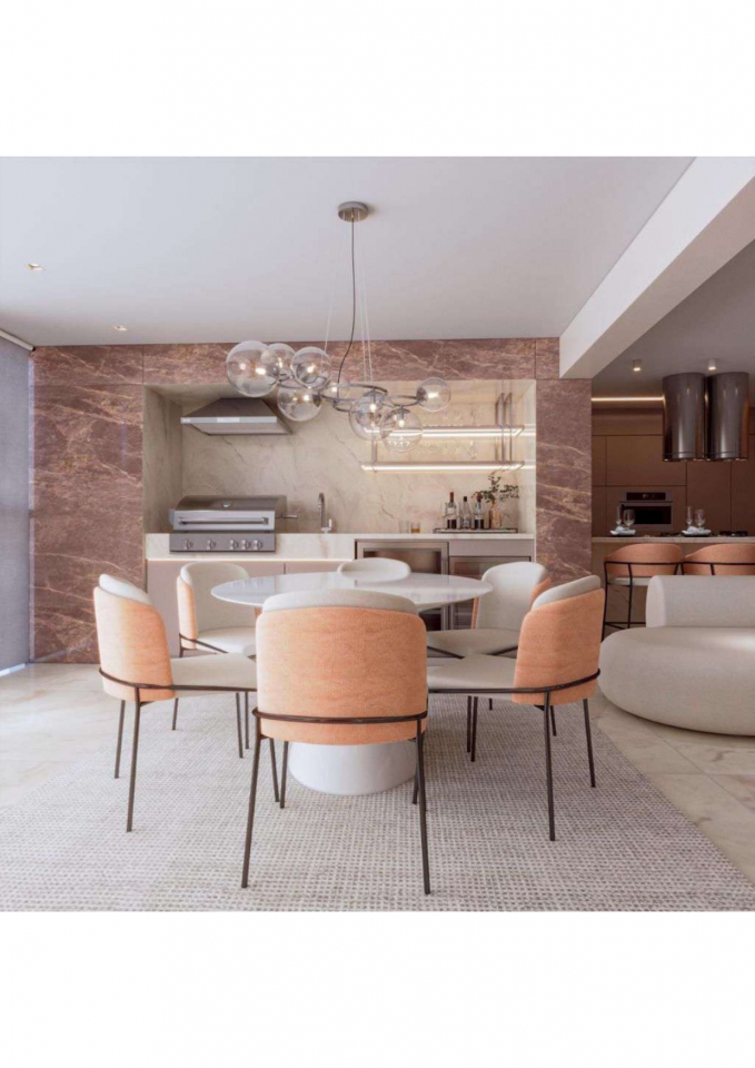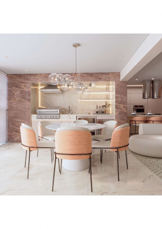 Este apartamento moderno e elegante é projetado com uma combinação harmoniosa de estética contemporânea e funcionalidade. O banheiro apresenta um design compacto e sofisticado, com azulejos em padrão chevron verde-azulado e detalhes minimalistas em madeira, criando uma sensação acolhedora. A área de estar e a cozinha são integradas, promovendo um ambiente aberto e fluido. A sala possui um sofá curvo de design arrojado e uma paleta de cores neutras que conferem serenidade ao espaço. A cozinha destaca-se com uma ilha central em mármore e cadeiras em tons de pêssego, combinando luxo e praticidade. O design inteligente e a iluminação bem planejada garantem um ambiente funcional e sofisticado, ideal para um estilo de vida contemporâneo.