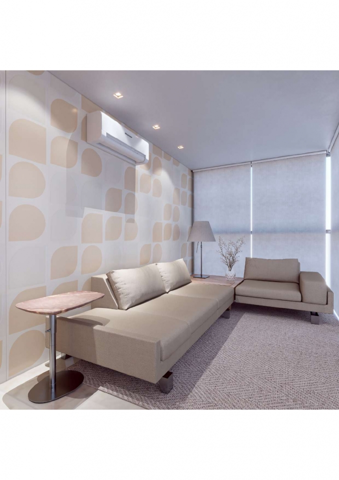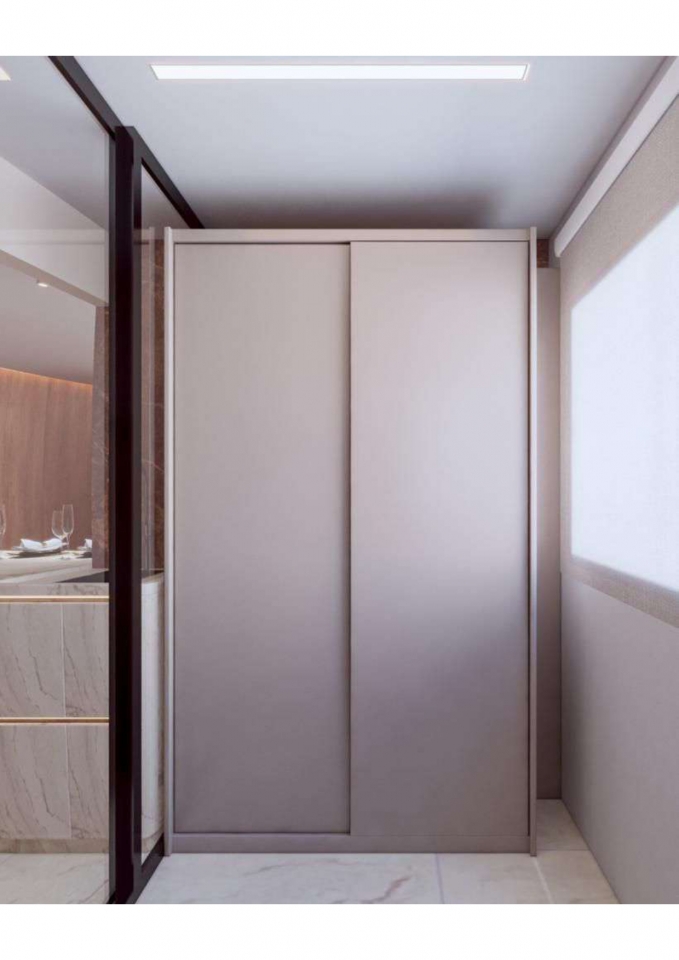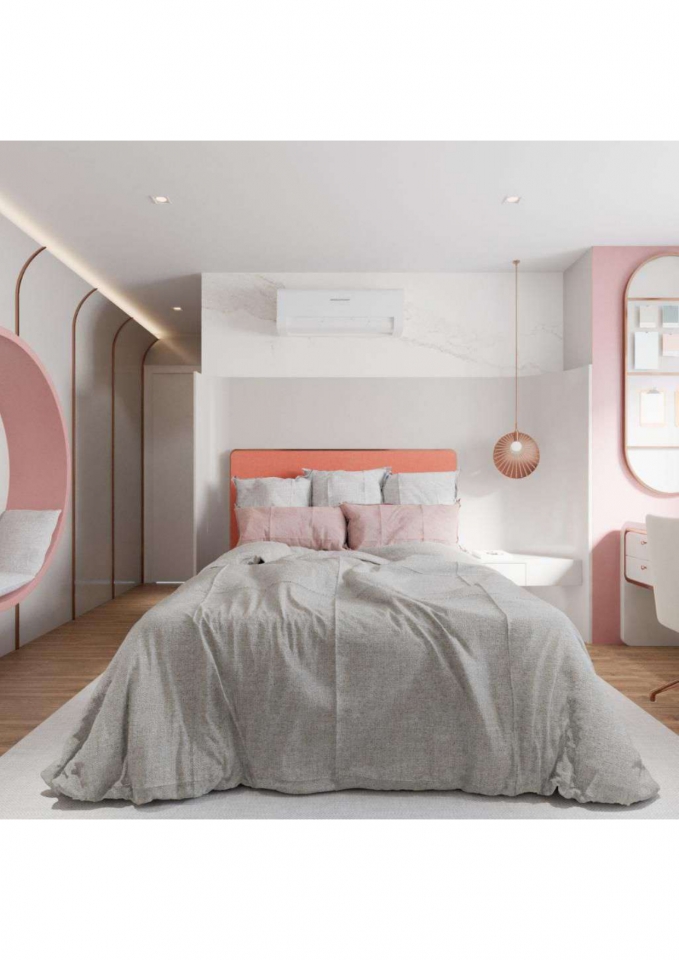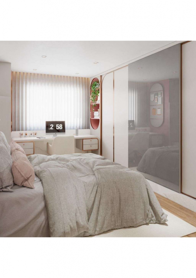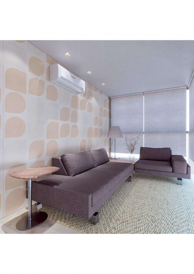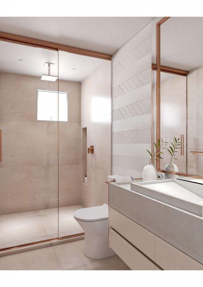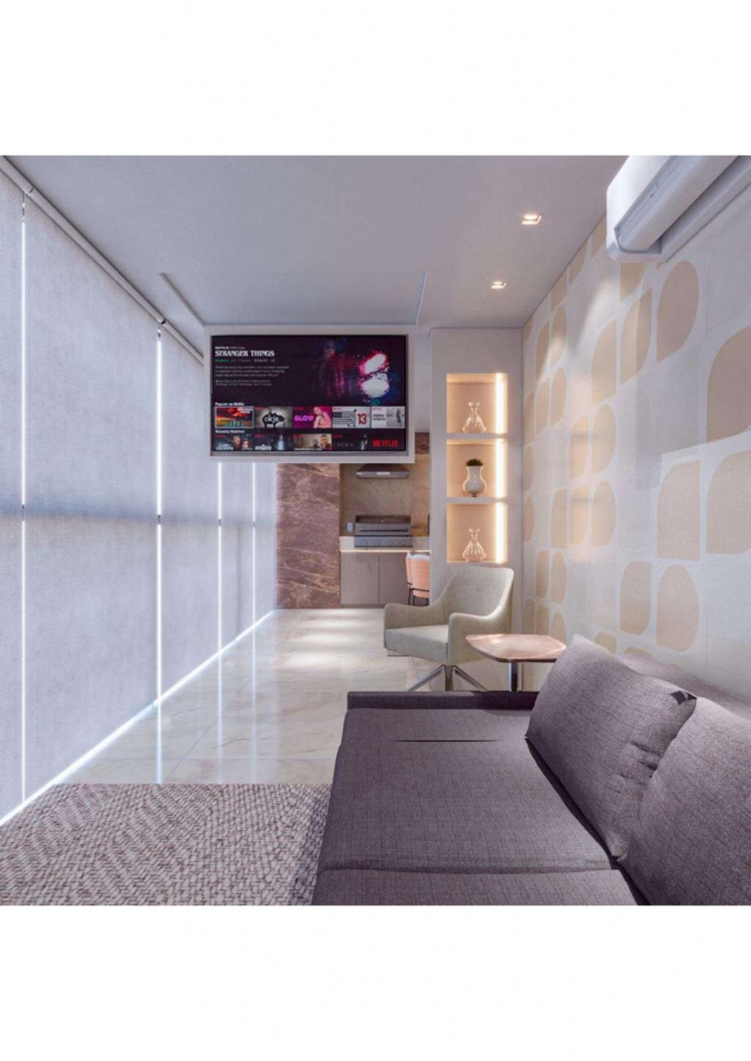 Este apartamento moderno e elegante é projetado com uma combinação harmoniosa de estética contemporânea e funcionalidade. O banheiro apresenta um design compacto e sofisticado, com azulejos em padrão chevron verde-azulado e detalhes minimalistas em madeira, criando uma sensação acolhedora. A área de estar e a cozinha são integradas, promovendo um ambiente aberto e fluido. A sala possui um sofá curvo de design arrojado e uma paleta de cores neutras que conferem serenidade ao espaço. A cozinha destaca-se com uma ilha central em mármore e cadeiras em tons de pêssego, combinando luxo e praticidade. O design inteligente e a iluminação bem planejada garantem um ambiente funcional e sofisticado, ideal para um estilo de vida contemporâneo.