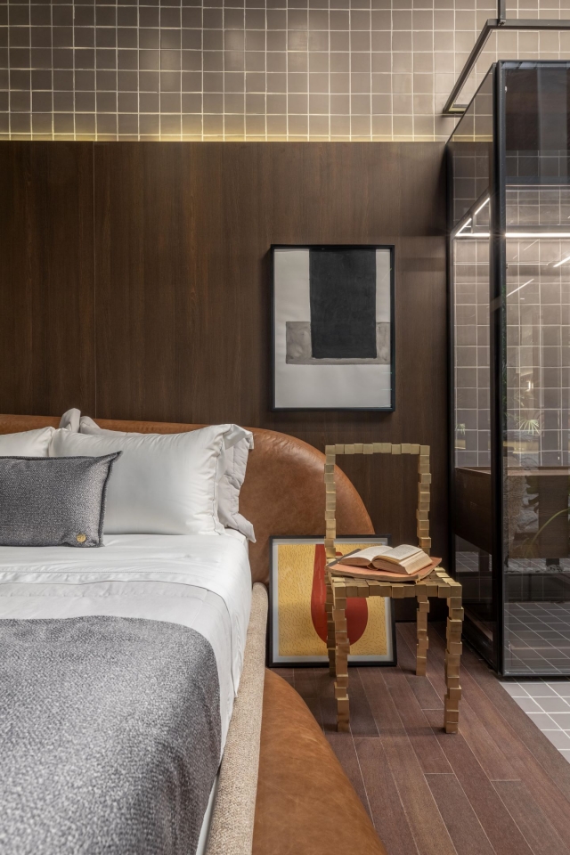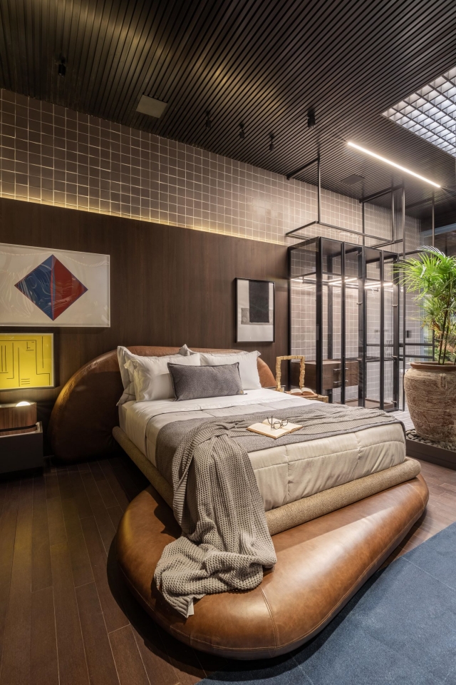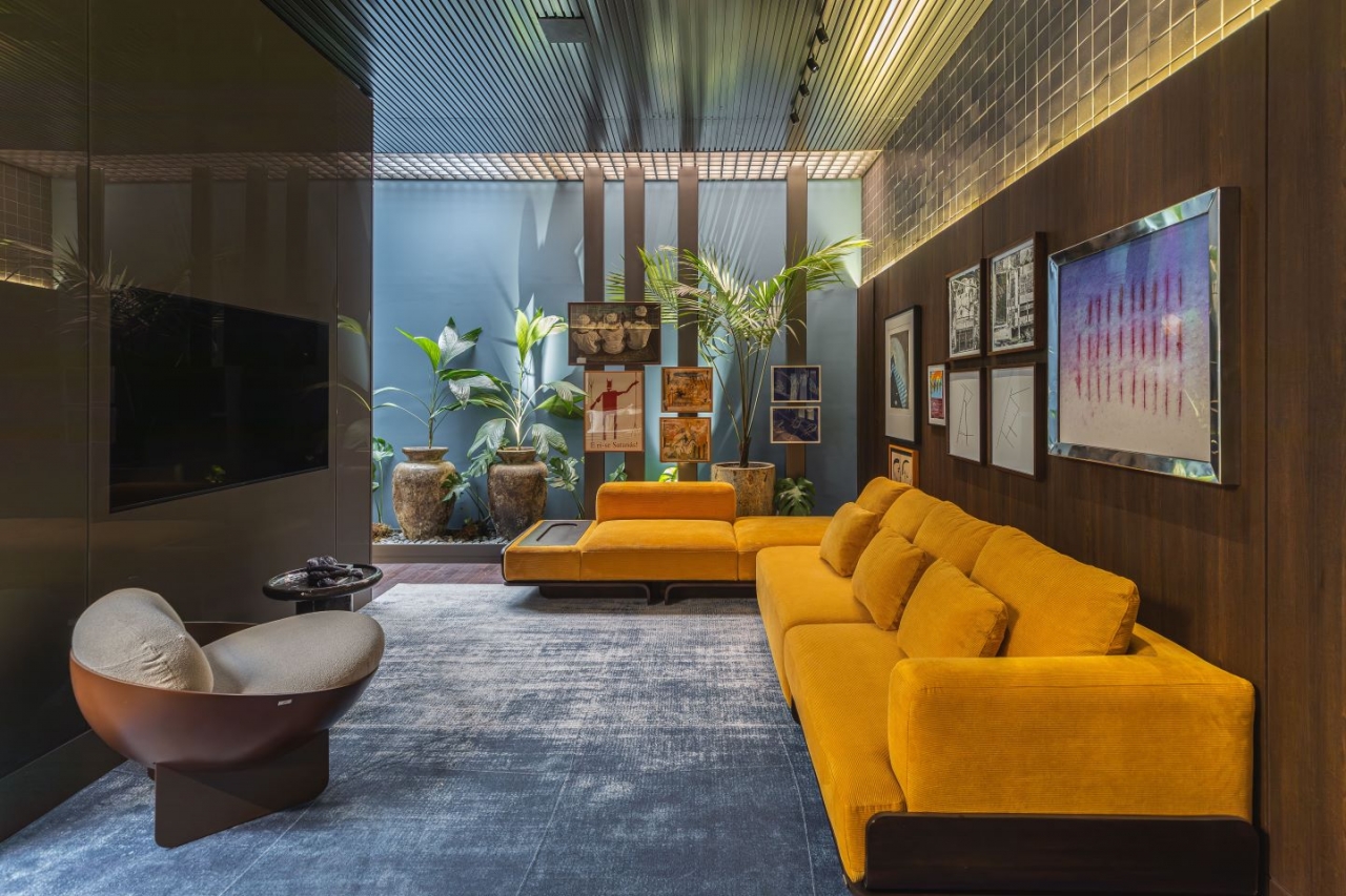 Com nomes que remetem ao alto escalão da arte moderna brasileira e internacional, a arquiteta emoldura os 55 m² do estúdio com um mix de obras, como as serigrafias do artista plástico e pintor lisboeta José Escada (1934 – 1980), do pintor carioca Florian Raiss e do artista plástico baiano Jorge Amaro.